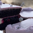 Кокосово-лавандовий крем зовні, шоколадні бісквіти та конфі з чорної смородини всередині. Декор мінімалістичний уквітчаний лавандою.